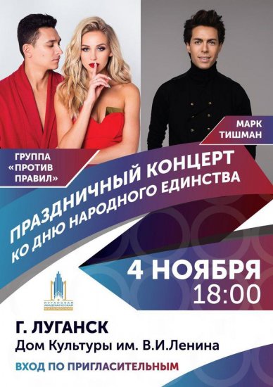 В Луганске 4 ноября состоится концерт ко Дню народного единства с участием российских исполнителей Марка Тишмана и группы «Против правил»