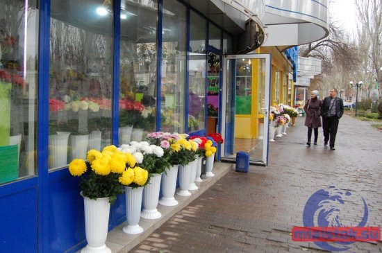 Как же без ярких цветов осенью? Парочка между прочим пошла в киоск за букетиком.