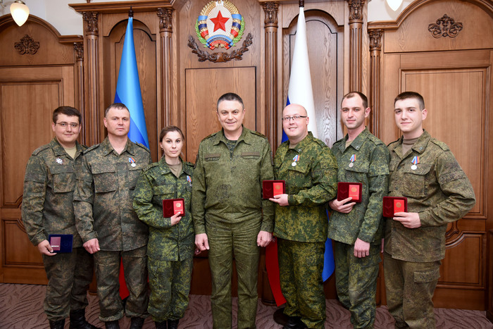 Пасечник вручил медаль «За боевые заслуги» старшему лейтенанту, заместителю начальника пресс-службы управления Народной милиции ЛНР Александру Мазейкину, старшему лейтенанту, руководителю отдела информационного обеспечения Екатерине Булатецкой, лейтенанту, военному корреспонденту пресс-службы управления Народной милиции ЛНР Антону Микужису, а также рядовым, военным корреспондентам пресс-службы управления Народной милиции ЛНР Дмитрию Медведеву и Кириллу Генсеру.