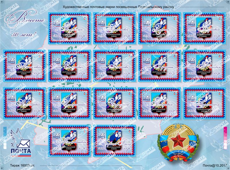 «27 октября 2017 года ГУП ЛНР "Почта ЛНР" вводит в обращение художественные почтовые марки из серии "Города ЛНР" "Перевальский район. На марках отображено: рисунок – герб Перевальского района, три цветные плашки в цветовой гамме флага ЛНР, рисунок, состоящий из четырех неправильных треугольников и трех кругов в цветовой гамме флага ЛНР, логотип "Почта ЛНР"; тексты: "Перевальск", " Артемовск", "Зоринск", "пгт Бугаевка", "пгт Михайловка", "пгт Селезневка", "пгт Ящиково", "пгт Городище", "пгт Фащевка", "пгт Комиссаровка", "пгт Центральный", "пгт Чернухино", "село Петровка", "село Адрианополь", "село Малоивановка", "поселок Червоный Прапор", "(Почта ЛНР 2017)», - говорится в сообщении.