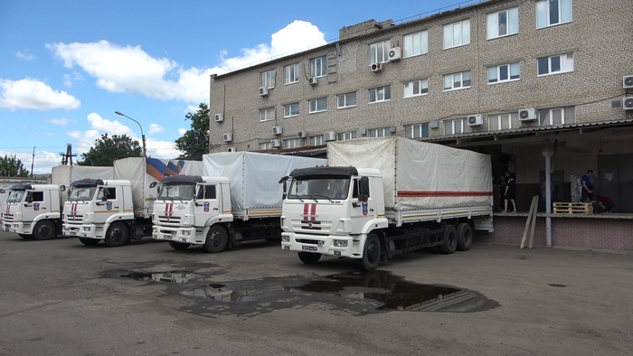 Автомобили 142-го конвоя МЧС России доставили в Луганск в качестве гумпомощи предметы первой необходимости и медикаменты.
