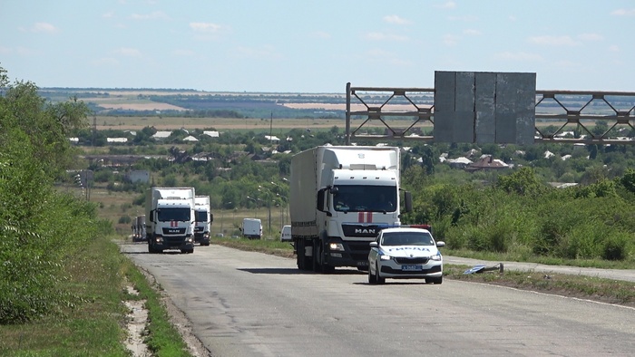 Автомобили 170-го конвоя МЧС России доставили в столицу ЛНР продукты питания, бутилированную воду и электрооборудование.