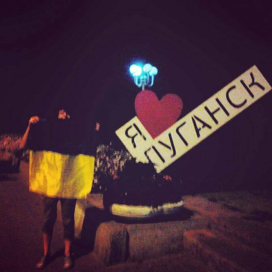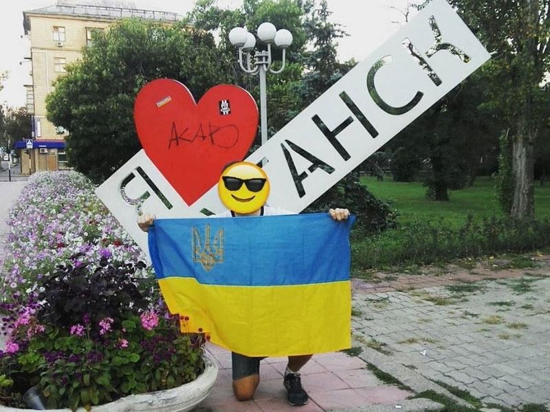 В социальной сети появились фотографии неизвестного, который запечатлен на входе в сквер имени Героев Молодой Гвардии возле памятного знака «Я люблю Луганск» с украинским флагом.
