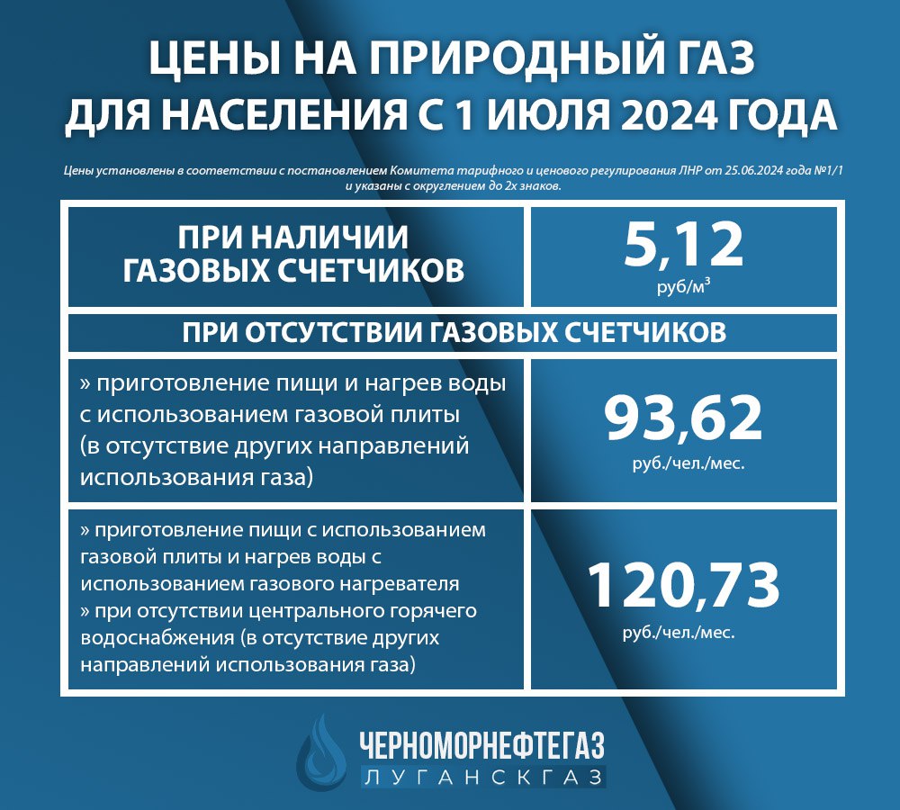 Согласно постановлению Комитета тарифного и ценового регулирования Луганской Народной Республики от 25 июня 2024 года №1/1 с 1 июля на территории Республики устанавливаются новые цены на природный газ, реализуемый для потребителей.