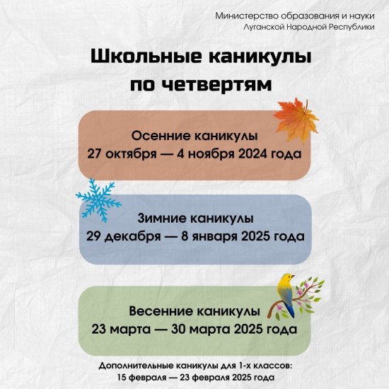 Министерство образования и науки ЛНР подготовило график каникул на учебный год 2024-2025.