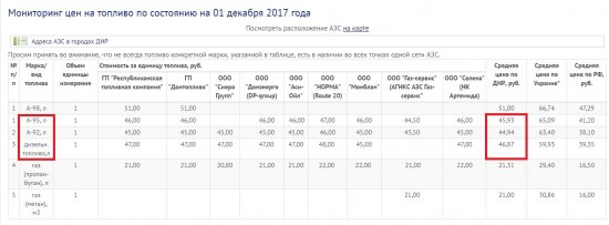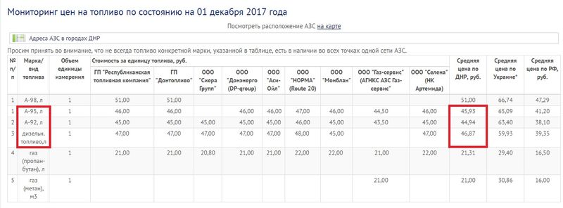 В Донецкой Народной Республике топливо реализуется по следующим ценам: