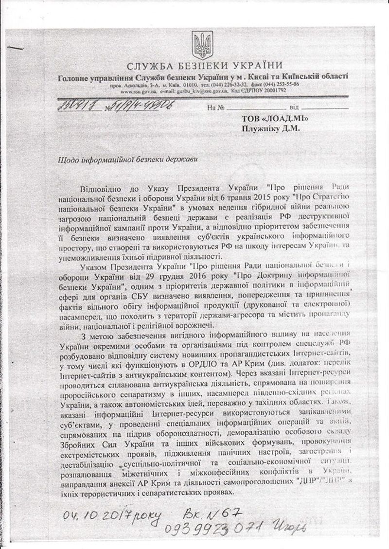 Отмечается, что письмо СБУ направлено провайдерам еще 4 октября 2017 года.