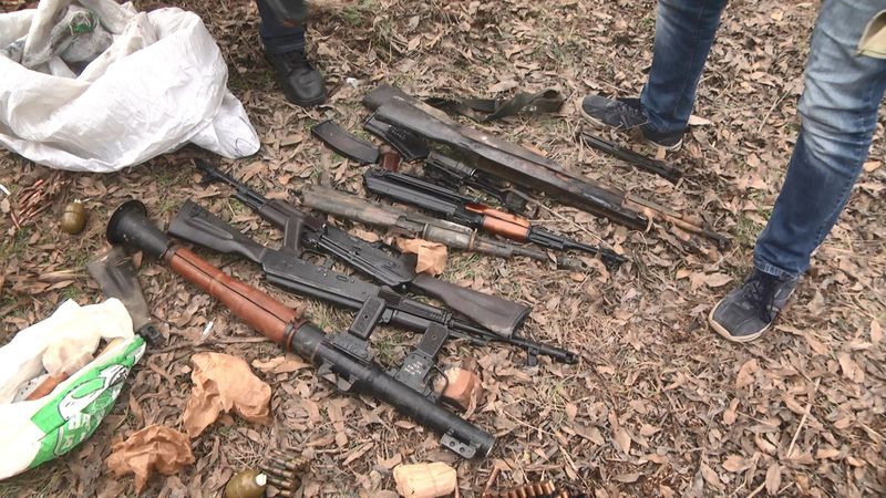 Отмечается, что правоохранители изъяли гранатомёты, автоматы, реактивную штурмовую гранату РШГ-1, реактивный пехотный огнемёт РПО-А, 10 гранат, 10 запалов УЗРГМ-2, 3 сигнальные мины СМ-320, 3 тротиловые шашки весом, 200 г аммонита, патроны, 21 электродетонатор, 3 пакета метательного заряда ВТМ, 3 предмета коричневого цвета конусообразной формы с выведенными проводами.