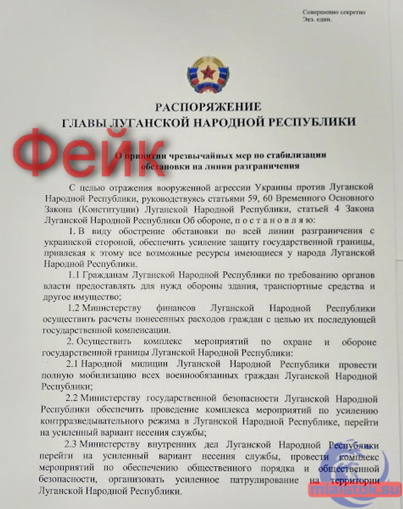 Информация со ссылкой на указ и.о. главы Луганской Народной Республики о дополнительных мобилизационных мероприятиях на территории Республики является ложной и распространяется провокаторами с целью посеять панику среди жителей.