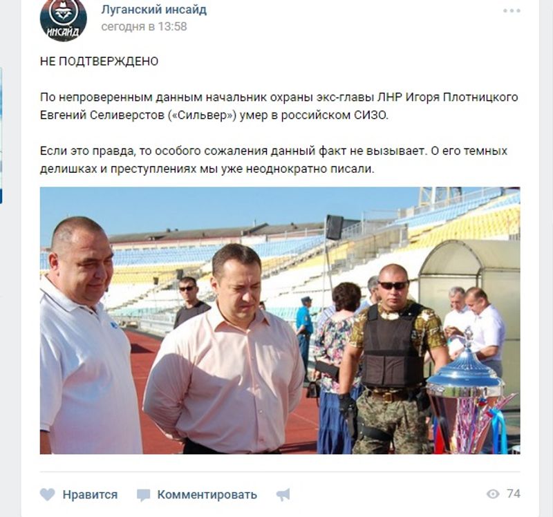 В социальной сети появилась информация, что начальник охраны бывшего главы Луганской Народной Республики Евгений Селиверстов (позывной «Сильвер») скончался в одном из российских СИЗО.