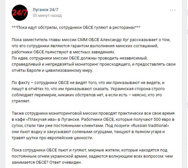 «Пока заместитель главы миссии СММ ОБСЕ Александр Хуг рассказывает о том, что его сотрудники являются гарантом выполнения минских соглашений, работники ОБСЕ пьянствуют в местных заведениях. По идее, сотрудники миссии ОБСЕ должны проводить независимый, справедливый и непредвзятый мониторинг происходящего, и предоставлять свои отчёты Европе и цивилизованному миру», - говорится в публикации админа.