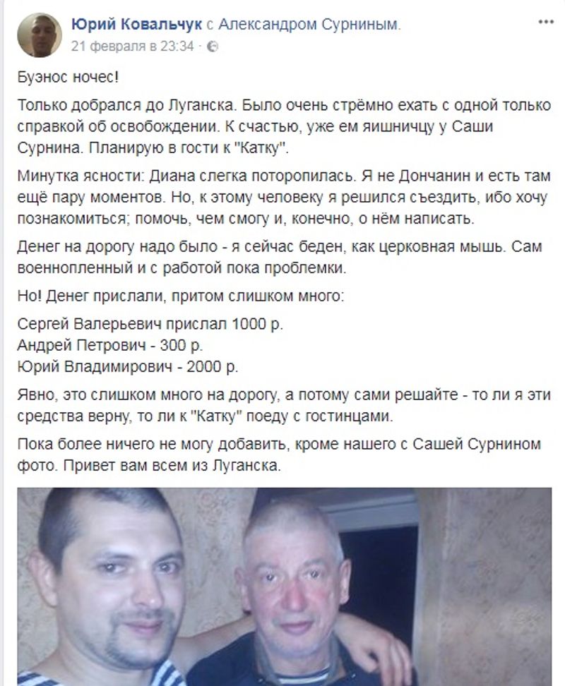 27 декабря 2017 года спецкор оказался на территории Донбасса в ходе обмена пленными между Республиками и Украиной, где проходил реабилитацию.