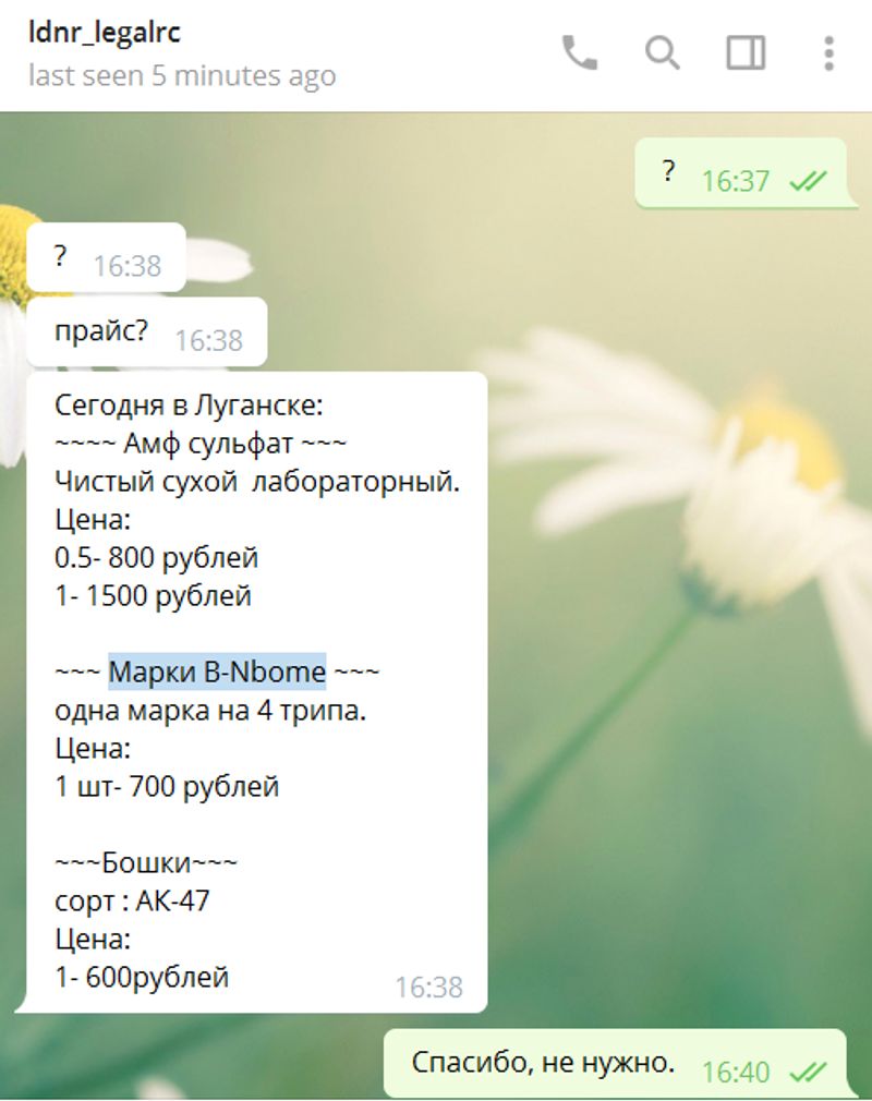 В самом сообщении содержатся названия наркотиков, а также ссылка на пользователя ldnr_legalrc в социальной сети Telegram.