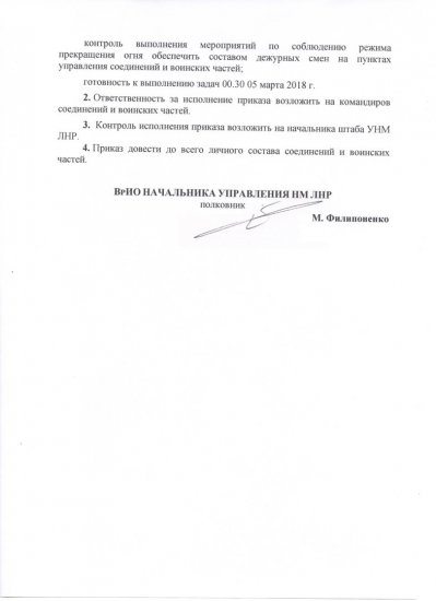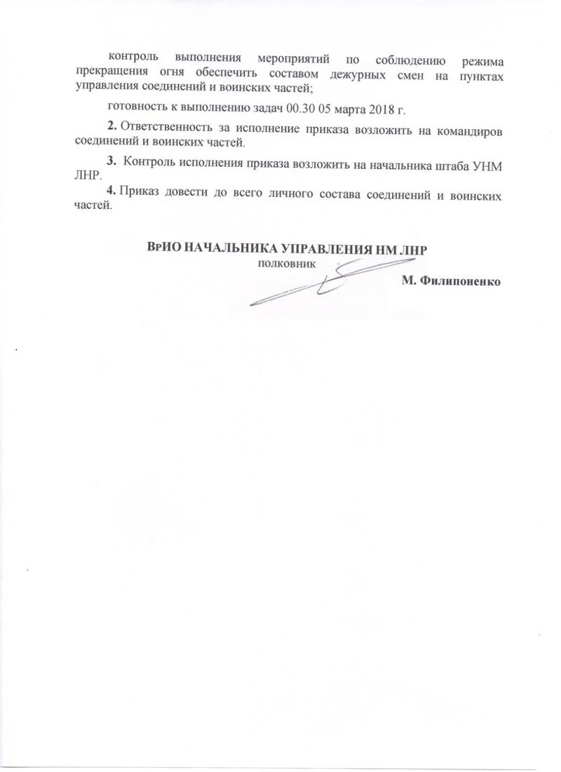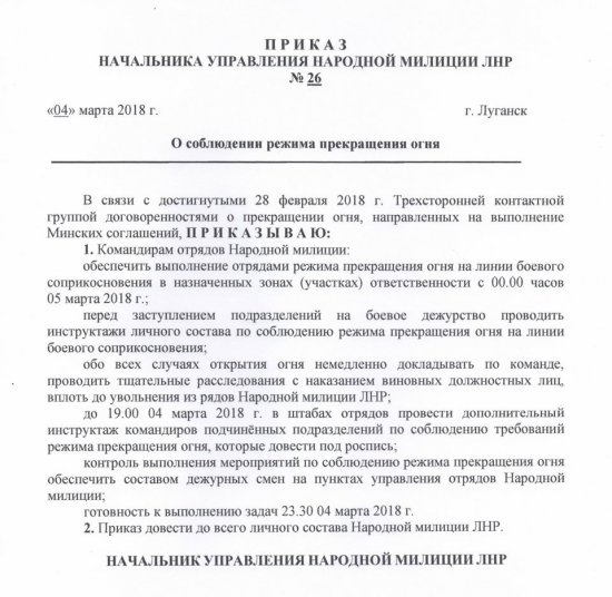 «В связи с достигнутыми 28 февраля 2018 года Контактной группой договорённостями о прекращении огня, направленных на выполнение Минских соглашений, приказываю: командирам отрядов Народной милиции обеспечить выполнение отрядами режима прекращения огня на линии боевого соприкосновения в назначенных зонах (участках) ответственности с 00.00 часов 5 марта 2018 года», - говорится в приказе.