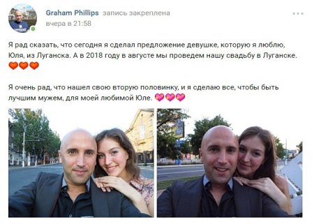 Известный военный корреспондент из Великобритании Грэм Филлипс принял решение женится на жительнице Луганска. Об этом 9 августа он сообщил на своей странице в социальности сети «ВКонтакте». Как написал сам британец, он уже сделал предложение своей возлюбленной – луганчанке Юлии. Через год молодые планируют сыграть свадьбу.