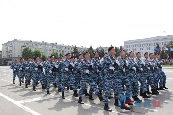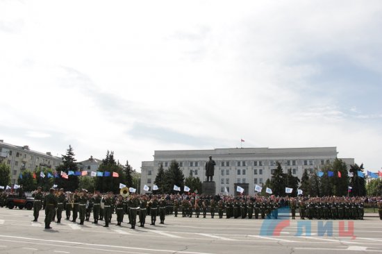 На площадь было внесено Знамя Победы и флаг ЛНР. Участие в параде также приняли военнослужащие и сотрудники правоохранительных органов ЛНР, МЧС, кадеты.
