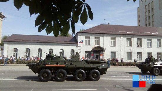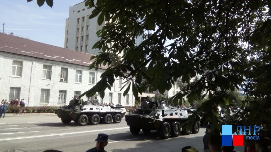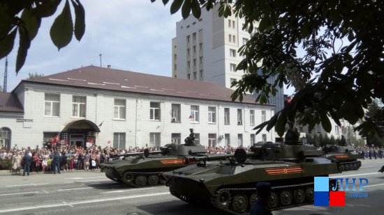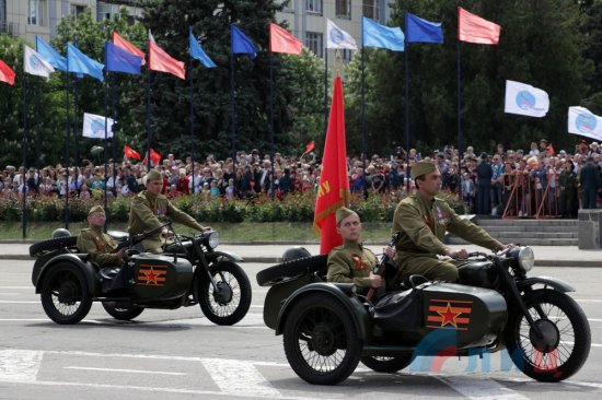 Отметим, что парад военной техники и вооружения возглавил танк Т-34, восстановленный после повреждений, полученных вследствие артиллерийского обстрела Луганска киевскими силовиками 17 апреля.
