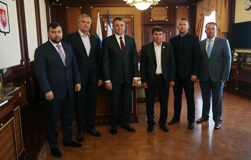 Глава Республики Крым вручил Пасечнику, председателю Народного Совета ЛНР Денису Мирошниченко и председателю Федерации профсоюзов ЛНР Олегу Акимову памятные подарки, в свою очередь руководитель ЛНР подарил Аксенову герб Луганской Народной Республики.