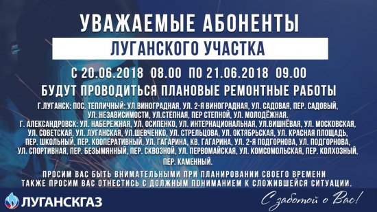 Государственное предприятие «Луганскгаз» сообщает о предстоящих плановых ремонтных работах и предупреждает о временном прекращении подачи газа некоторым жителям Луганска.
