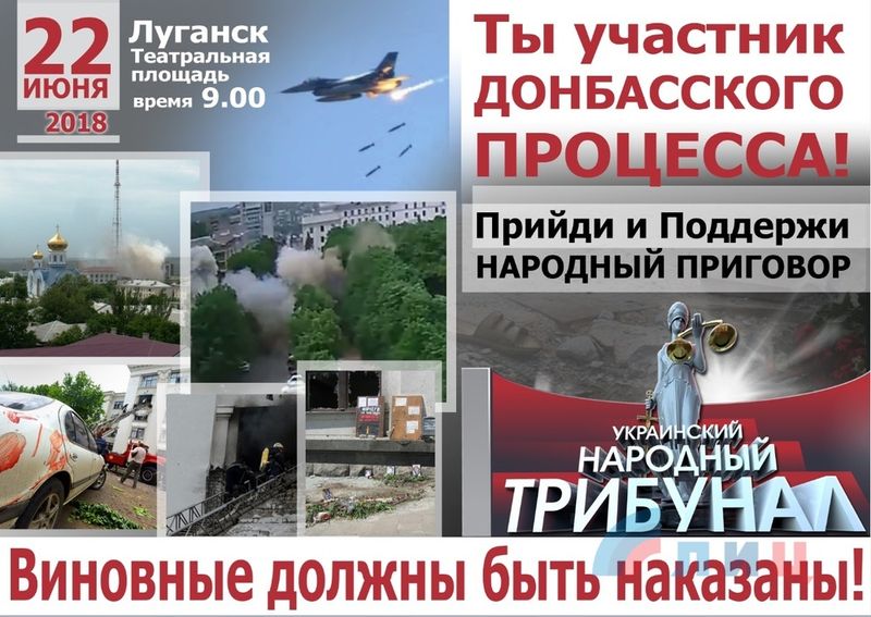 Сегодня, 22 июня, украинский народный трибунал по расследованию военных преступлений режима Петра Порошенко против граждан Украины,, прибывший в Луганск, приговорил президента Украина Петра Порошенко за преступления, совершенные против народа Донбасса, к пожизненному заключению с конфискацией имущества.