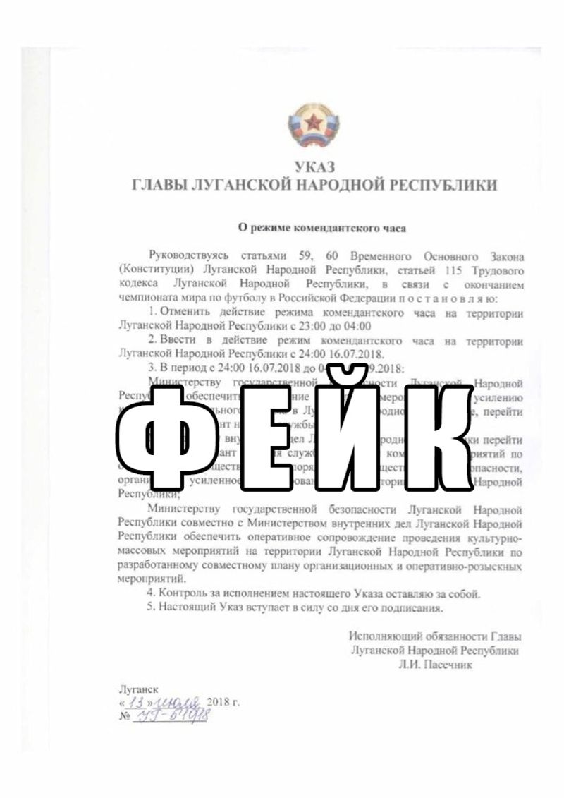 В соцсетях появился документ якобы о том, что и.о. главы ЛНР Леонид Пасечник сократил режим комендантского часа с 23:00 до 24:00.