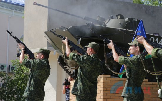 Затем автоколонной участники мероприятия проследовали к памятнику «Я десантник» (БМД-2 у Театра на Оборонной), где с участием официальных лиц прошел митинг в честь Дня ВДВ. После минуты молчания в память о погибших при защите Республики десантниках к мемориальному комплексу курсанты Лутугинского военно-патриотического клуба «Вымпел» возложили Гирлянду Славы. Военнослужащие Народной милиции ЛНР в память о погибших дали ружейный салют. Присутствующие на митинге возложили к БМД венки и цветы.