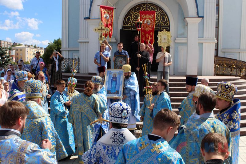 Священники Луганской и Ровеньковской епархий Украинской православной церкви Московского патриархата провели праздничную литургию, крестный ход и водоосвятный молебен в день престольного праздника луганского храма в честь иконы Божией Матери «Умиление».