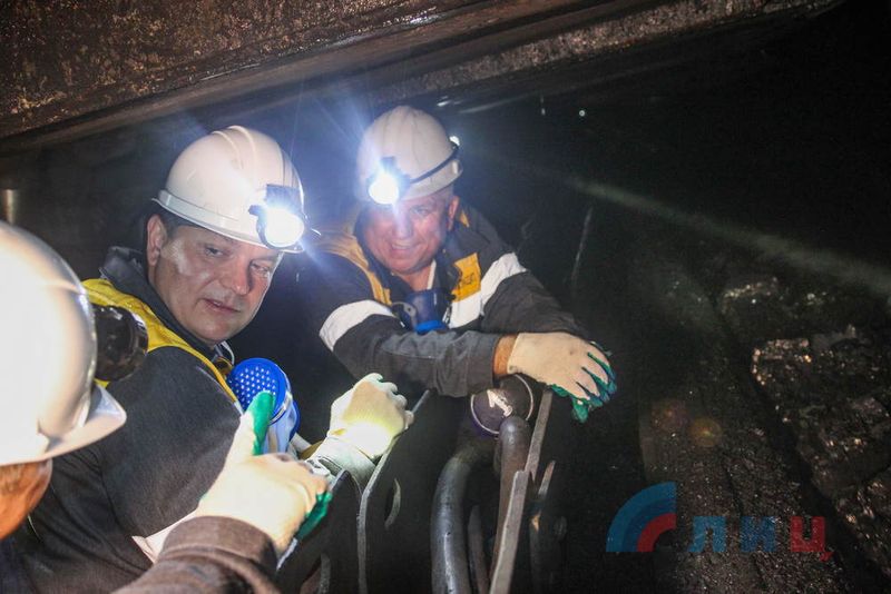 Исполняющий обязанности главы ЛНР Леонид Пасечник спустился в забой шахты имени Вахрушева шахтоуправления «Ясеновское», где ознакомился с производственной технологией добычи угля в новой лаве.