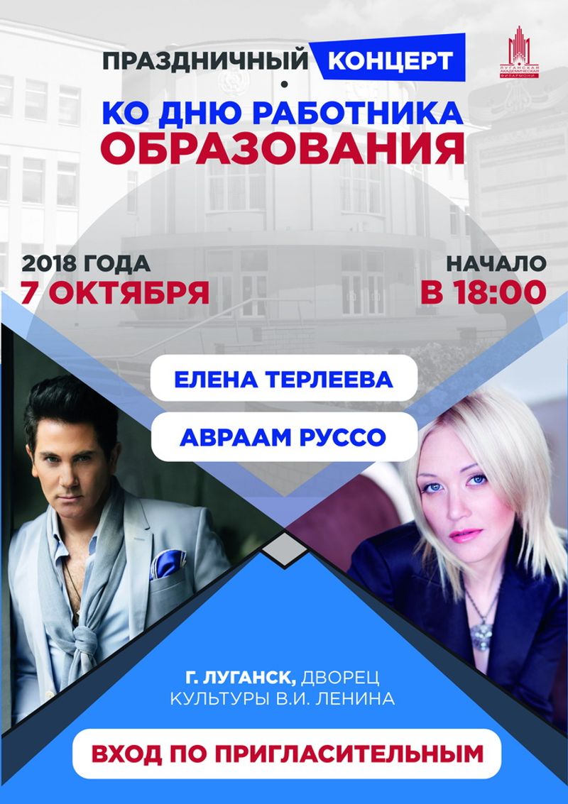 Известные российские эстрадные исполнители Авраам Руссо и Елена Терлеева 7 октября выступят в Луганске с праздничным концертом, посвященный Дню работника образования.