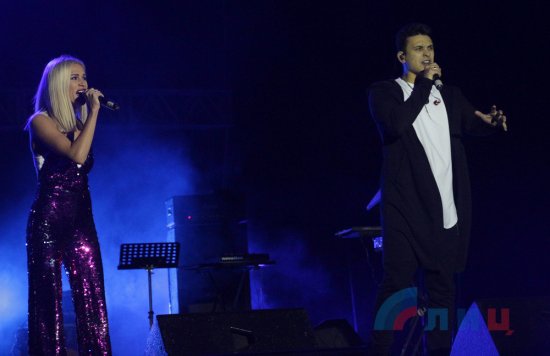 Концерт открылся выступлением впервые приехавших в ЛНР солистов группы «Против правил» Кирилла Астапова и Валерии Сушиной.