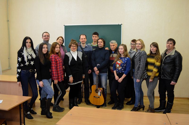В преддверии нового года филологи Далевского университета пообщались с поэтами из литературно-музыкального объединения «Мир творчества». Среди гостей присутствовали: руководитель организации Артём Аргунов, ведущий и автор литературно-музыкального объединения Андрей Короленко и лидер Луганской группы «Искусство» Евгений Калашников.