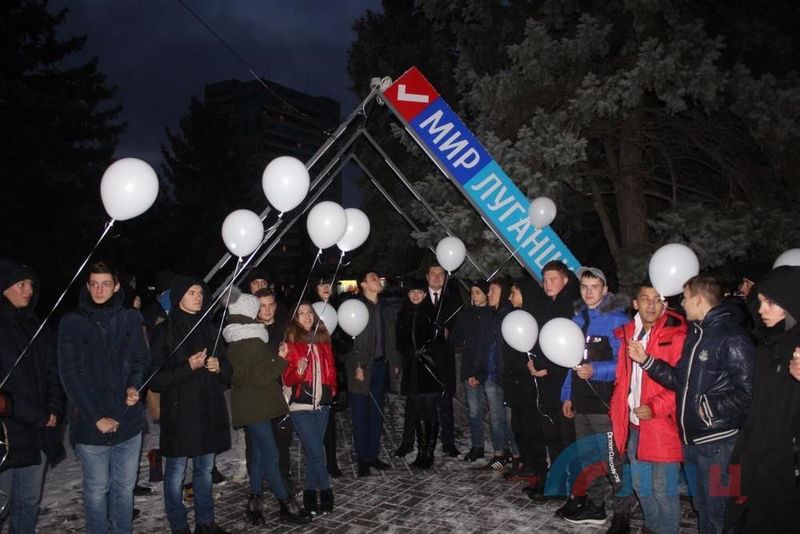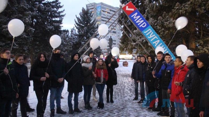 В рамках акции движения «Живи ярче» возле арт-объекта общественного движения «Мир Луганщине» в центре Луганска в сквере имени Героев Великой Отечественной войны прошел молодёжный флешмоб.