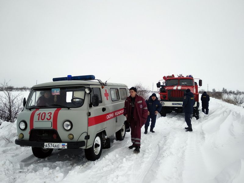 Министерство чрезвычайных ситуаций города Лутугино освободили из снежных заносов беременную женщину, которую везли на скорой помощи в больницу.