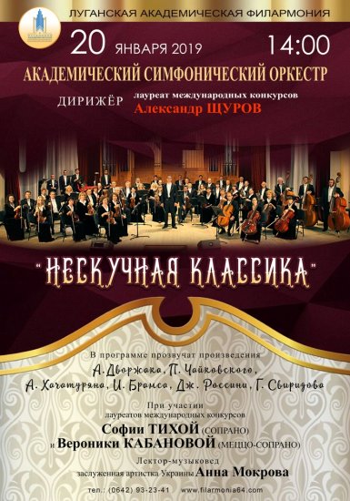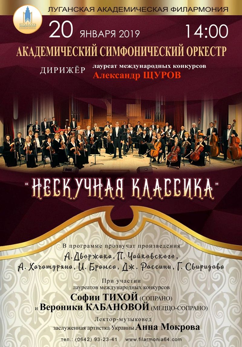 Концерт состоится 20 января в 14:00 под руководством Александра Щурова, который исполнит произведения П. Чайковского, А. Хачатуряна, К. Сен-Санса, Г. Свиридова, И .Брамса, Я. Сибелиуса, А.Дворжака.