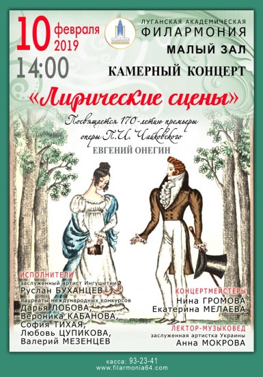 Во время концерта солисты в малом зале Луганской академической филармонии представят концертную программу «Лирические сцены», посвященную 170-летию премьеры оперы П. И. Чайковского «Евгений Онегин».