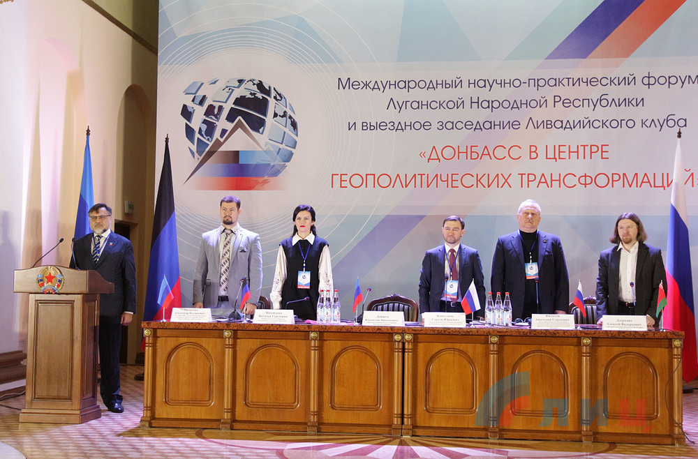 На открытии форума министр иностранных дел ЛНР Владислав Дейнего зачитал приветственное слово от имени главы Луганской Народной Республики Леонида Пасечника.