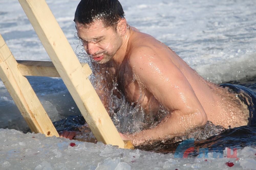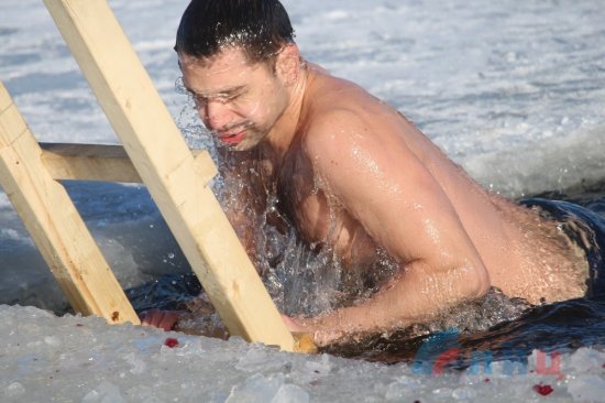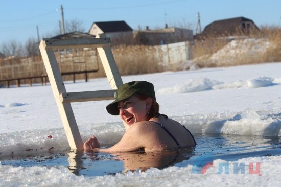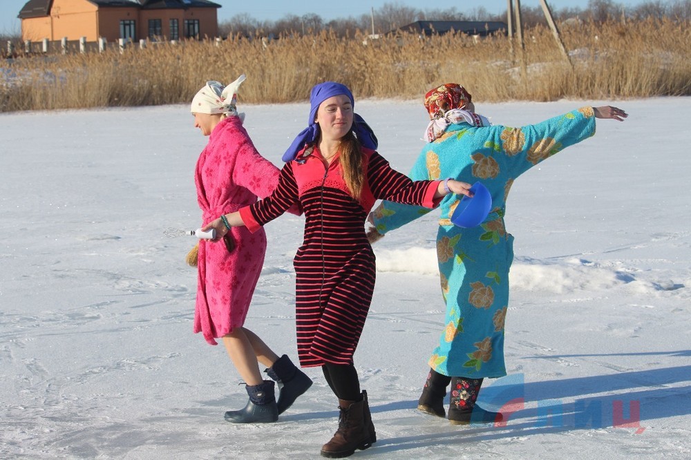 Женская часть коллектива луганского клуба закаливания и зимнего плава поздравила мужчин с 23 февраля концертной программой у проруби.