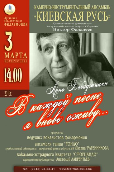 Концертную программу «Арно Бабаджанян: «В каждой песне я вновь оживу…», посвященную творчеству великого композитора представит в филармонии в 14:00 коллектив под руководством заслуженного деятеля искусств Украины Виктора Фалалеева.