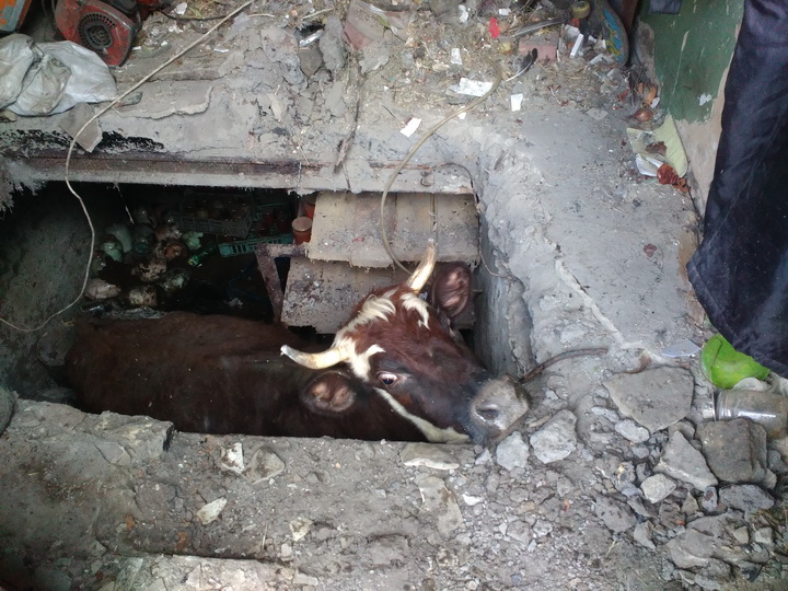 На горячую линию сообщили о том, что животное попало в погреб и не может выбраться. По прибытию бригады спасателей было установлено, что погреб находится в помещении летней кухни и корова упала на глубину около 2-х метров. Отмечается, что узкий спуск в погреб усложнил ситуацию по безопасному извлечению скота.