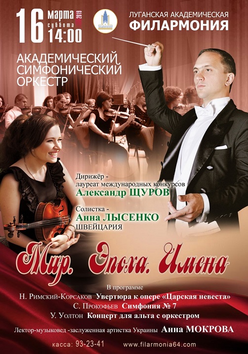 Сообщается, что 16 марта альтистка из Швейцарии Анна Лысенко совместно с оркестром Луганской академической филармонии под управлением Александра Щурова представят концертную программу «Мир. Эпоха. Имена».