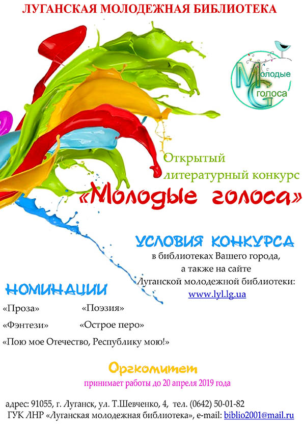 Министерство культуры, спорта и молодежи Луганской Народной Республики совместно с Луганской молодёжной библиотекой организовали проведение открытого литературного конкурса «Молодые голоса».
