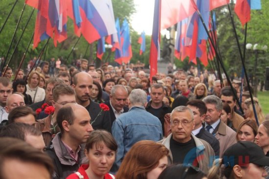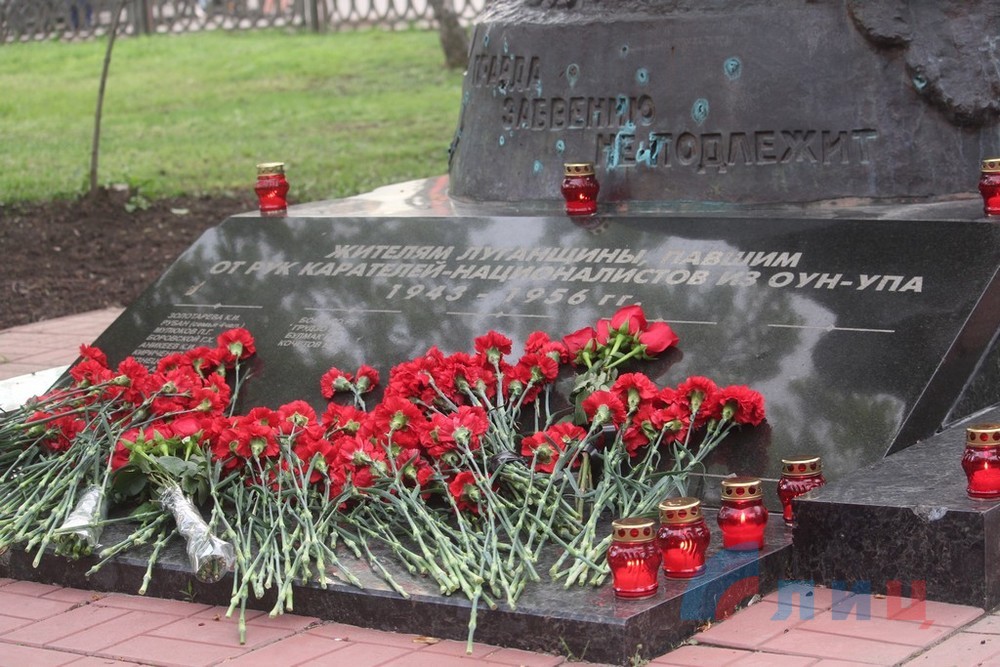 В столице Луганской Народной Республики возле памятника жителям Луганщины, павших от рук ОУН-УПА, состоялся митинг-реквием, посвященный годовщине трагедии 2 мая 2014 года в одесском Доме профсоюзов.