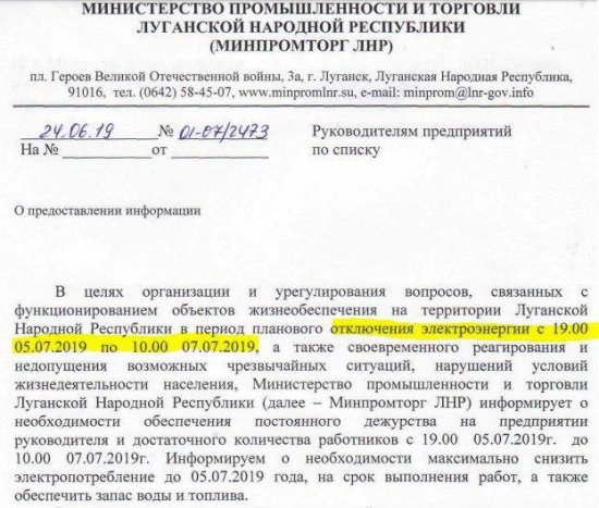 Министерство промышленности и торговли ЛНР информирует о плановом отключении электроэнергии на территории Республики с 5 по 7 июля.