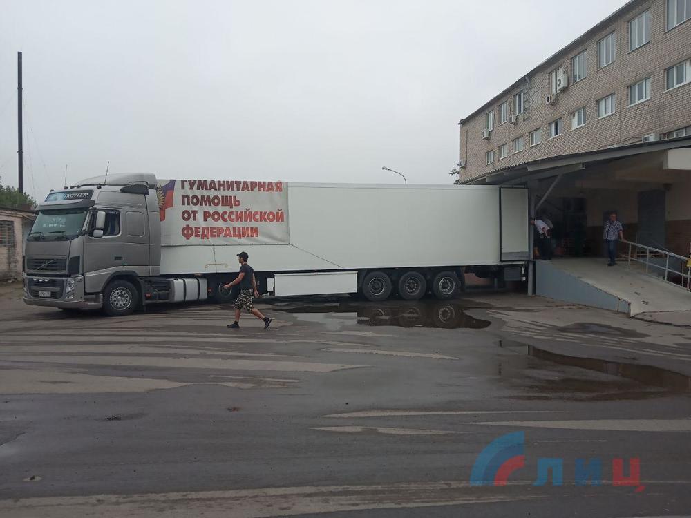 Автомобили 85-го конвоя Министерства чрезвычайных ситуаций России с гуманитарной помощью для жителей Донбасса прибыли на склады в Луганске.