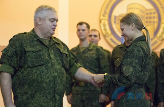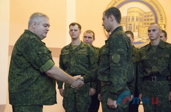 Приказ о присвоении студентам звания младший лейтенант запаса зачитал Гусев, вручали погоны курсантам начальник отдела военного комиссариата ЛНР по Жовтневому и Ленинскому районам Луганска Олег Теренин и старший преподаватель военной кафедры ЛНУ Валентин Пастухов. Выпускники кафедры получили специальность «Командир взвода связи сухопутных войск».