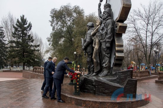 После подписания сотрудники Генпрокуратуры ЛНР и делегаты от Южной Осетии возложили цветы к памятнику защитникам ЛНР «Они отстояли Родину».