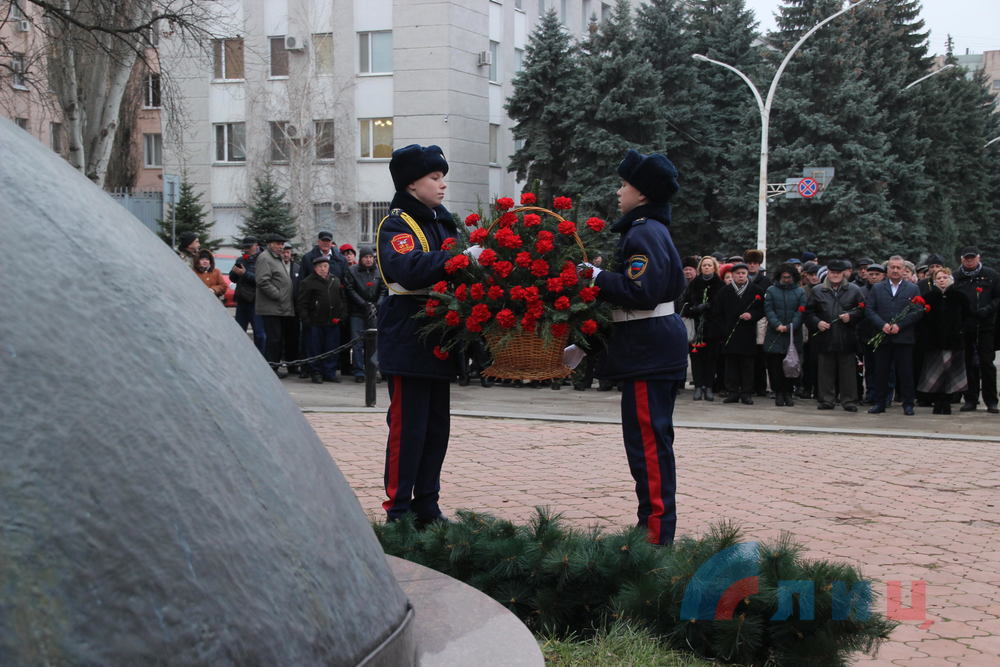 Кадеты Луганского казачьего кадетского корпуса имени маршала авиации Александра Ефимова возложили к подножию мемориала Гирлянду Славы от главы ЛНР, правительства, Народного Совета республики и столичной администрации.