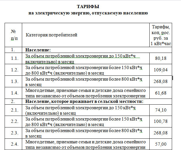 Согласно постановлению, с 1 февраля в Республике будут действовать следующие тарифы на электроэнергию: