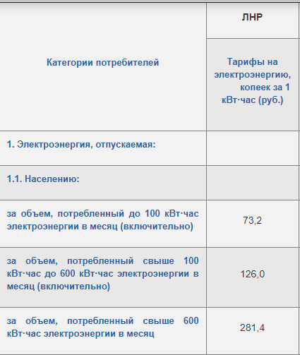 Напомним, что с 2017 года на территории ЛНР установлены следующие тарифы:
