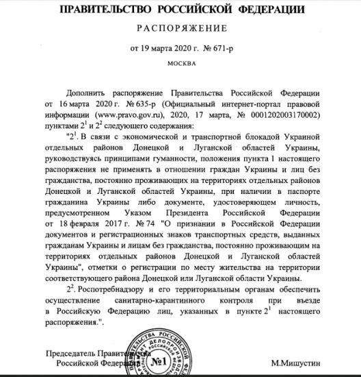 Правительство РФ приняло распоряжение, в котором говорится, что жители ЛНР с украинским гражданством могут пересекать границу с Россией во время введенного там карантина из-за распространения коронавируса.